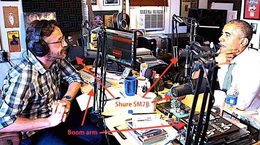 Muchos usuarios optan por un brazo articulado, también conocido como soporte giratorio. Un brazo articulado se sujetará a su escritorio y se puede colocar de acuerdo con su configuración y la distancia de grabación preferida. Marc Maron usa un brazo articulado como este brazo de montaje Samson para montar sus micrófonos Shure SM7B.