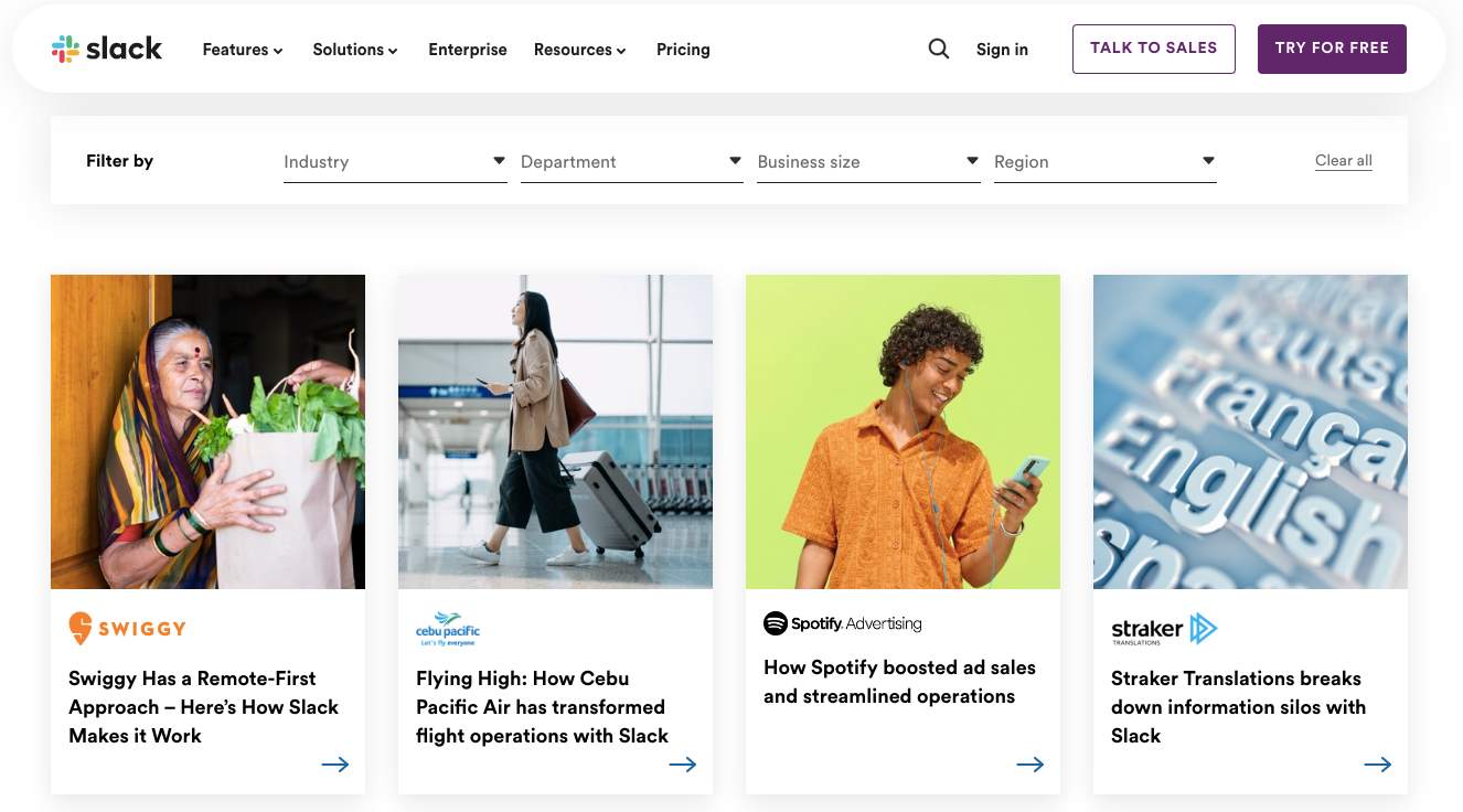 Además de guías útiles y artículos de blog, la biblioteca de recursos de Slack tiene otra página llamada "Historias de clientes". Aquí es donde comparten sus estudios de casos, destacando las organizaciones que han aprovechado Slack con éxito para mejorar sus flujos de trabajo, comunicación y productividad general. Presentar historias de clientes como estudios de casos es algo que también notamos en la estrategia de marketing de contenidos de Marketo.