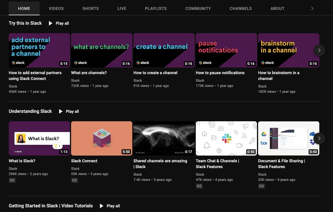 Esta categorización de videos facilita a los usuarios localizar información específica, ya sea que estén buscando tutoriales, consejos avanzados o información relacionada con la seguridad. Dado que la mayoría de los videos duran menos de 3 minutos, los usuarios pueden interactuar con el contenido sin sentirse abrumados. Slack también presenta transmisiones en vivo ocasionales y publica algunos cortos de YouTube, diversificando la combinación de contenido.