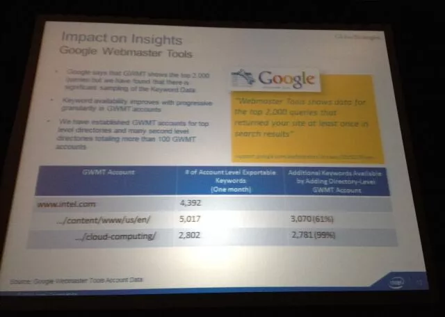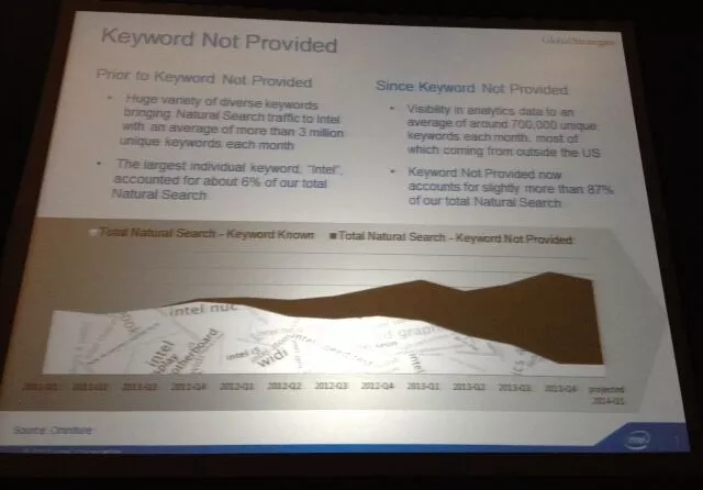Antes de la palabra clave (no proporcionada), Intel tenía una gran variedad de palabras clave que atraían el tráfico de búsqueda natural a Intel (aproximadamente 3 millones de palabras clave universales por mes con la consulta de navegación "Intel" que representaba aproximadamente el 6 % de nuestro tráfico de búsqueda natural total).