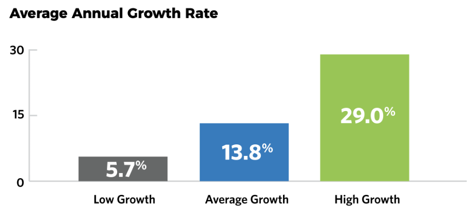 La muestra se segmentó en empresas de alto crecimiento (el 25% de crecimiento más rápido) y empresas de bajo crecimiento (25% de crecimiento más lento). El 50% en el medio fueron designados como empresas de Crecimiento Medio. La Figura 1 muestra las tasas de crecimiento para cada grupo. Las empresas de alto crecimiento están creciendo más de 5 veces más rápido que sus pares de bajo crecimiento.