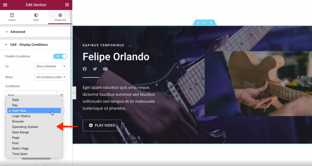 Condiciones de visualización es otro widget en esta lista. Los usuarios de Elementor pueden administrar la visibilidad del contenido a través de la plantilla y sus reglas de visualización. Pero la condición de visualización de los EAU le da control sobre cada widget directamente en su página actual, sin necesidad de crear una plantilla. La mejor parte es que funciona con cualquier widget de Elementor, ya sea de Elementor, UAE o cualquier complemento de terceros.