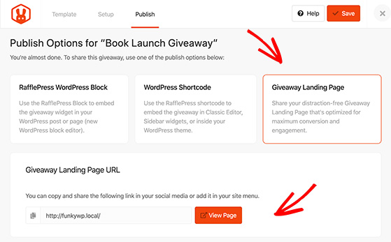 Cuando esté listo para publicar su obsequio, puede usar el bloque RafflePress WordPress, un código abreviado o crear una página de destino del obsequio.
