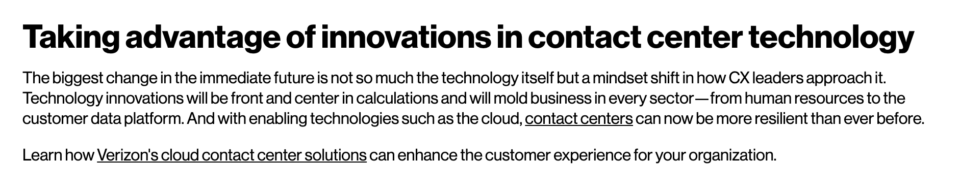 Un CTA Lire la suite / En savoir plus encourage votre public à s'engager avec des actifs d'entonnoir plus profonds ou des pages de solutions. Cela fonctionne bien au stade de la prise de conscience, lorsqu'un public peut rechercher une solution à un problème ou essayer de comprendre une tendance émergente qui peut constituer une opportunité pour lui. Un CTA Lire la suite / En savoir plus peut trouver une place naturelle à la fin d'un article de blog ou d'un article, comme nous le voyons dans ce CTA de Verizon Business :