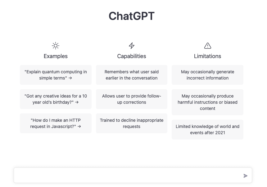 "Tout" peut sembler un peu extrême, mais les chiffres ne mentent pas : ChatGPT a connu 1 000 000 d'utilisateurs… en seulement 5 jours. Le chatbot est essentiellement une conversation avec un robot ; les questions sont répondues (rien de nouveau), mais il révise également ses réponses en fonction du suivi qu'il reçoit de l'humain. Et, c'est assez lisse. Ce modèle de langage est devenu si populaire qu'OpenAI a dû développer des moyens créatifs pour détourner les gens :