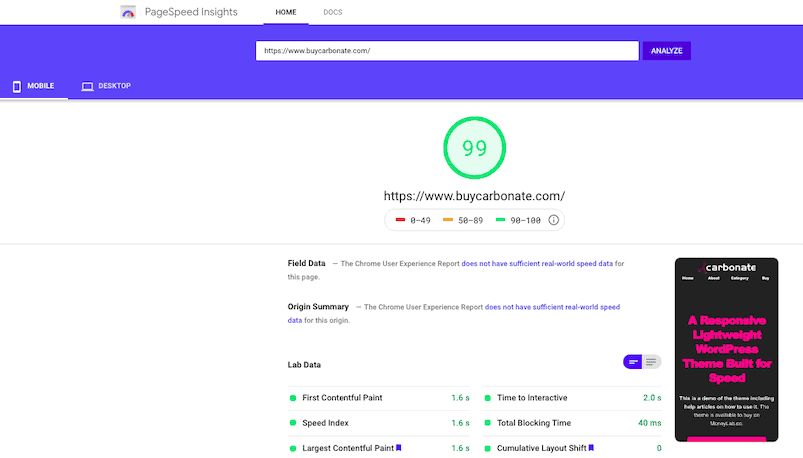 Le site de démonstration thématique, BuyCarbonate.com, obtient un excellent 99/100 sur mobile et ordinateur de bureau sur le test PageSpeed Insights de Google. Cependant, il est important de noter que le site est très basique et ne contient aucun des plugins, scripts ou images qu'un site WordPress standard pourrait contenir.