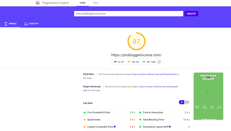 Dans le « monde réel », vos résultats peuvent différer. Par exemple, un site affilié qui utilise Carbonate, ProBloggerIncome.com, a obtenu un score bien inférieur de 87/100 sur mobile et de 98/100 sur ordinateur . C'est toujours beaucoup plus rapide que votre site WordPress moyen, surtout s'il n'a pas fait d'optimisations supplémentaires.