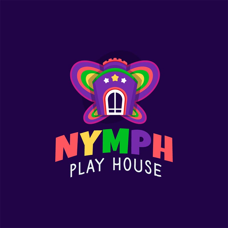 Dans un cycle de vie d'insecte, les jeunes sont parfois appelés une nymphe . Ce terme représente le nom commercial et le but de Nymph Play House. Cette maison de jeu pour enfants utilise un logo papillon coloré avec une maison de poupée au centre. La palette de couleurs arc-en-ciel attirera immédiatement l'attention des clients potentiels, en particulier les jeunes enfants.