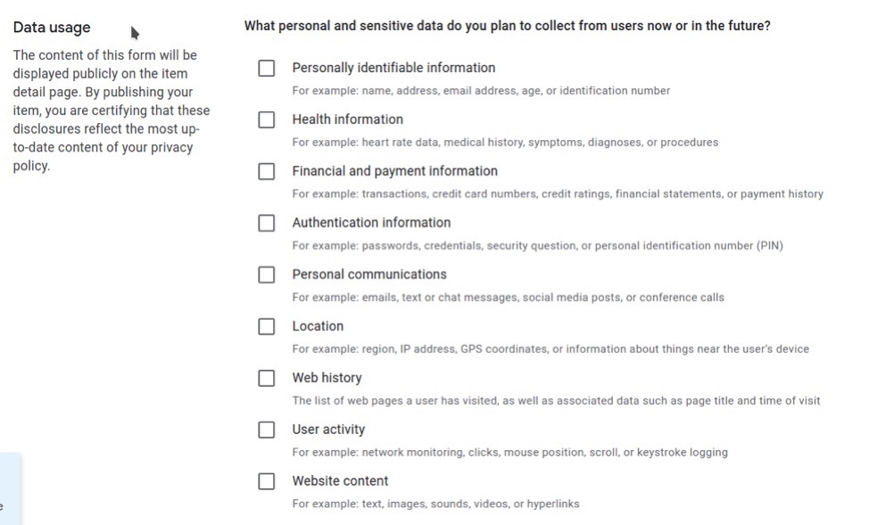 Convert Experiences n'est pas affecté par ces changements de confidentialité. Cependant, en octobre 2020, nous avons téléchargé notre extension Chrome Convert Debugger mise à jour sur le Chrome Web Store et avons dû effectuer nous-mêmes cet exercice de confidentialité. Notre extension ne collecte aucune donnée qui pourrait être utilisée en dehors de l'extension elle-même, vous pouvez donc voir ci-dessous toutes les cases que nous avons cochées :