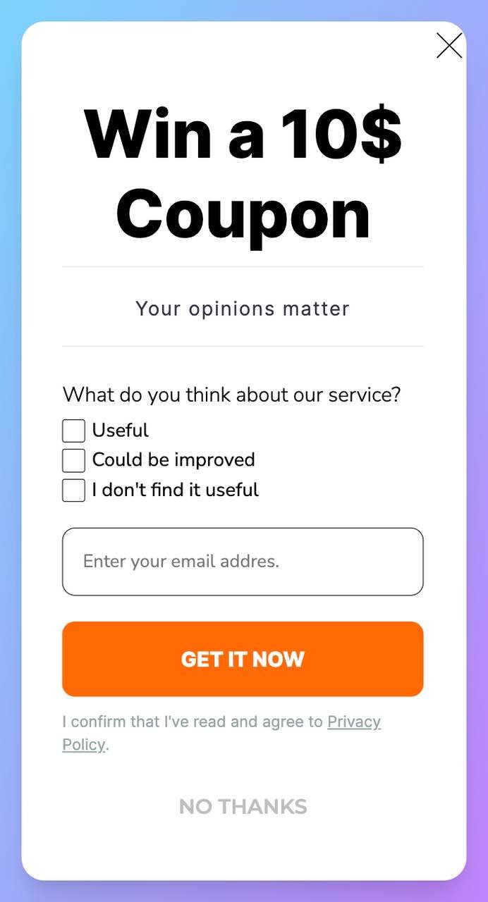 Vous pouvez également utiliser des popups pour demander à vos clients des témoignages et leur offrir un bon, des coupons ou des réductions pendant une durée limitée pour créer FOMO.