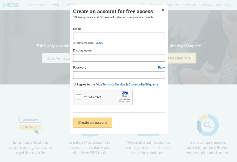 Pour une exécution légèrement meilleure, les développeurs peuvent consulter un exemple comparable de MOZ. Leur outil d'exploration de liens offre des fonctionnalités similaires - il fournit aux utilisateurs des informations exploitables. Cependant, il comprend également un élément de capture de plomb qui transforme l'objectif en action. En d'autres termes, il garantit que chaque personne utilisant la ressource se transforme potentiellement en client payant.
