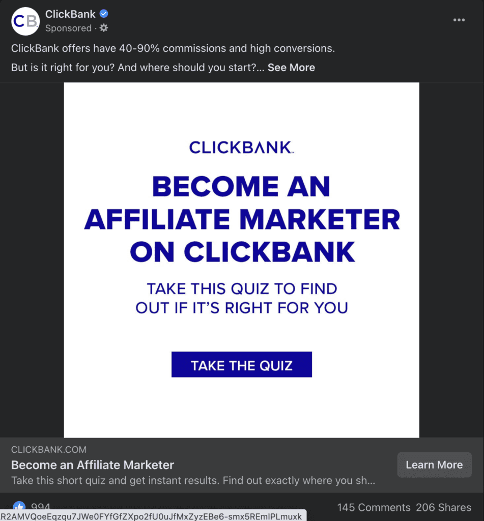 Votre création publicitaire variera considérablement en fonction de votre offre. Nous voyons beaucoup de personnes tester avec des annonces illustrées statiques au début. Cela a tendance à très bien fonctionner pour susciter la curiosité et vendre un clic vers un article de blog, un publireportage ou une autre page de pont, qui pointe ensuite vers votre hoplink (généralement avec un CTA proéminent comme un lien dans le texte, une image de bannière ou un bouton) .