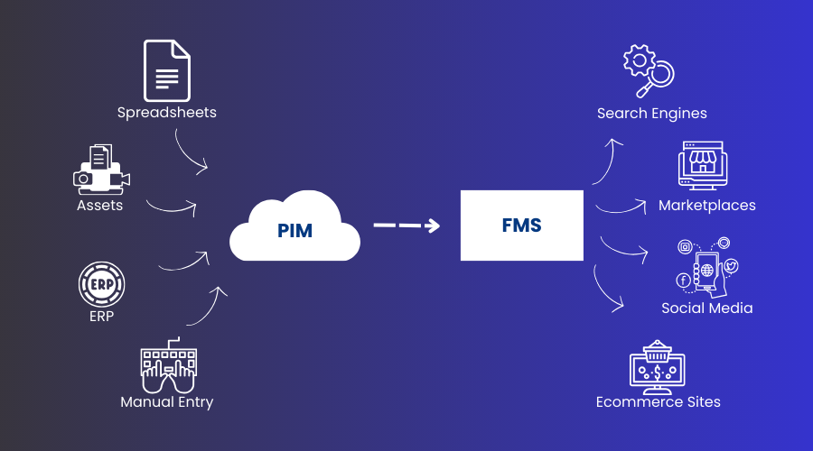 La gestion des informations sur les produits (PIM) et les systèmes de gestion des flux (FMS) fonctionnent ensemble de manière transparente pour rationaliser le processus de gestion et de distribution des données sur les produits sur différents canaux en ligne.