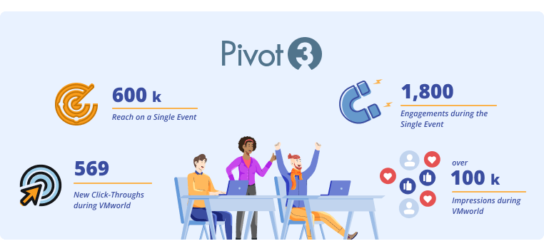 Un succès particulier qu'ils ont constaté a été le partage de contenu tweeté en direct lors d'événements de l'industrie comme VMworld. Au cours de cet événement seul, Pivot3 a atteint plus de 600 000 personnes avec 569 clics en rendant le contenu facile à partager pour les partenaires et le personnel présents lors de vos déplacements.