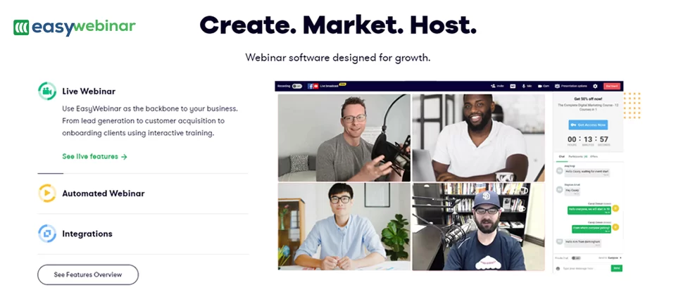 EasyWebinar est à la fois une plateforme de diffusion en direct et un outil d'automatisation du marketing. Vous pouvez tirer parti de la plate-forme pour organiser des ateliers, des webinaires et des masterclasses afin de dépasser votre concurrent tout en vous permettant de développer votre marketing grâce à des webinaires automatisés et en direct.
