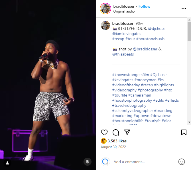Brad Blosser dengan cepat menjadi nama rumah tangga di kancah videografi Houston. Dengan perhatian yang tajam terhadap detail dan hasrat untuk bercerita, Brad menggunakan kamera videografer terbaik untuk menangkap semangat musik, vlogging, tema jalanan, dan acara. Profil Instagram-nya merupakan bukti keserbagunaan dan bakatnya, menjadikannya pilihan yang tepat untuk konten video yang kolaboratif dan menarik.