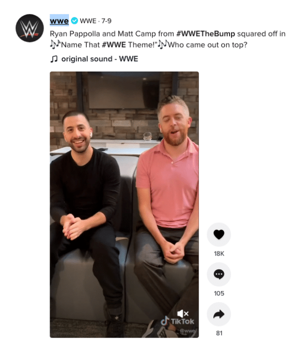 Salah satu taktik yang digunakan WWE di TikTok adalah sesekali bersenang-senang dengan permainan interaktif yang menampilkan beberapa stafnya. Ini tidak selalu tentang superstar, karena staf dapat menempatkan diri mereka pada posisi seorang penggemar. Misalnya, permainan head-to-head sederhana antara dua staf WWE di mana mereka menebak musik tema untuk superstar menghasilkan banyak keterlibatan: