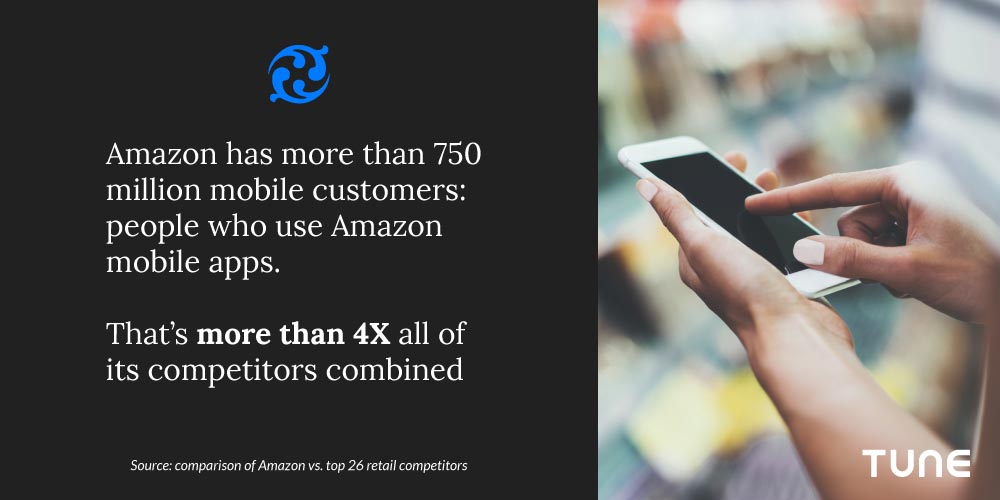 Tidak ada perangkat komputasi pribadi selain ponsel modern, dan merek yang menang secara tidak proporsional hidup di "perangkat tiga kaki" ini ... tidak pernah lebih dari tiga kaki dari tubuh Anda. Inilah tepatnya bagaimana Amazon menang — seperti yang kami tunjukkan dalam laporan Dinosaurus Unicorn kami, Amazon memiliki lebih dari 750 juta pelanggan seluler: orang-orang yang menggunakan aplikasi seluler Amazon.