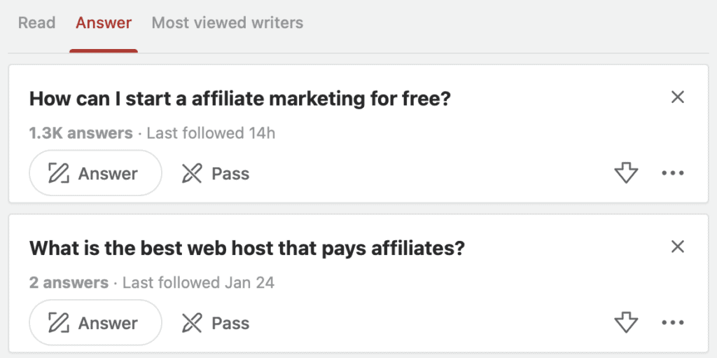 Setiap kali seseorang mengajukan pertanyaan yang berkaitan dengan niche Anda, Anda dapat memberikan jawaban dan mengarahkan mereka ke situs afiliasi eksternal Anda. Butuh waktu, tetapi dedikasi untuk Quora akan membuat Anda melihat lalu lintas organik ke situs web afiliasi Anda dalam waktu singkat.