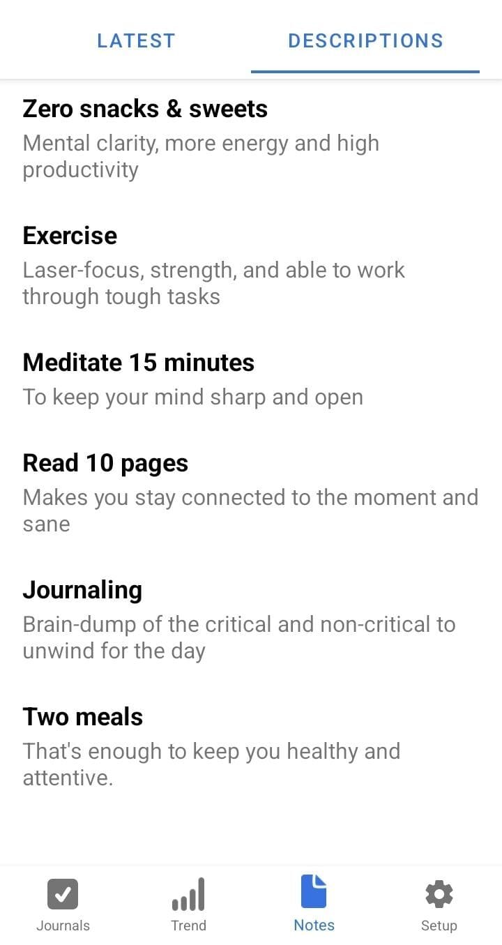 Fitur menonjol dari Cara Hidup adalah Deskripsi untuk setiap kebiasaan. Saat membentuk kebiasaan baru dan menghentikan kebiasaan buruk, penting bagi saya untuk menjelaskan kepada diri sendiri mengapa saya ingin melakukan salah satu dari 2 hal tersebut. Aplikasi ini mempermudah saya dengan memungkinkan saya menambahkan penjelasan singkat mengapa saya melakukan kebiasaan ini.
