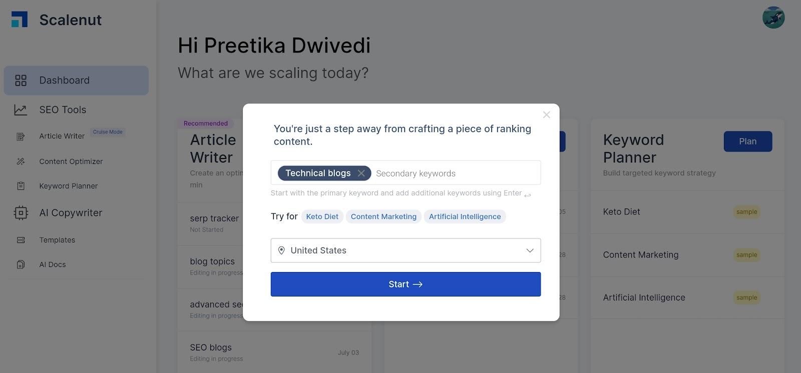 Anda dapat menggunakan Penulis AI Scalenut (Mode Jelajah) untuk membuat draf pertama blog Anda yang didukung AI dalam waktu 5 menit. Cukup klik tombol "Buat", masukkan kata kunci utama Anda, pilih lokasi, dan klik tombol Mulai.