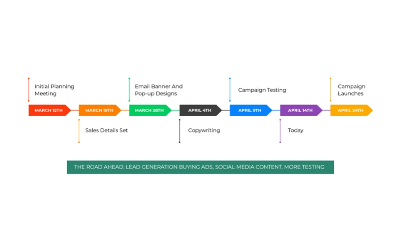 Di sini, garis waktu kampanye penjualan liburan disajikan dalam format sederhana dan penuh warna. Ini menggambarkan berapa banyak kemajuan yang telah dibuat, dengan catatan tentang pekerjaan lain apa yang tersisa untuk dilakukan di bagian bawah. Dengan cara ini, tim penjualan tahu salinannya telah dikirim, penulis tahu spanduk email sudah selesai, dan semua orang tahu apa yang masih perlu dikerjakan.