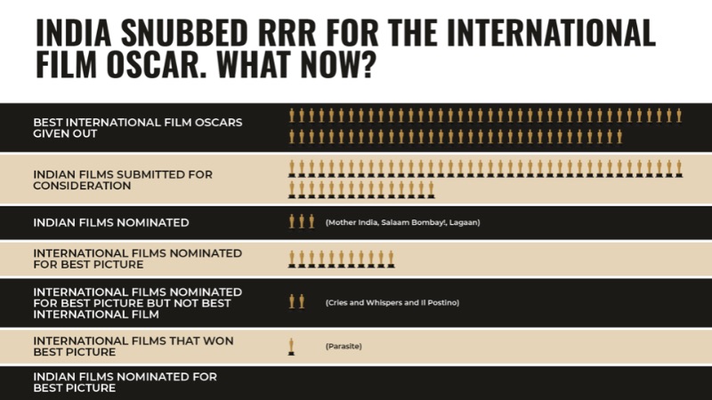 Contoh visualisasi data di atas menggunakan berita terkini di industri film. India telah lalai memasukkan RRR , film favorit penggemar, sebagai kandidatnya untuk Oscar Film Internasional Terbaik. Sementara RRR masih memiliki dukungan kuat di dalam dan di luar Akademi, grafik ini memberi Anda gambaran tentang seberapa besar perjuangan berat yang dihadapinya sekarang.