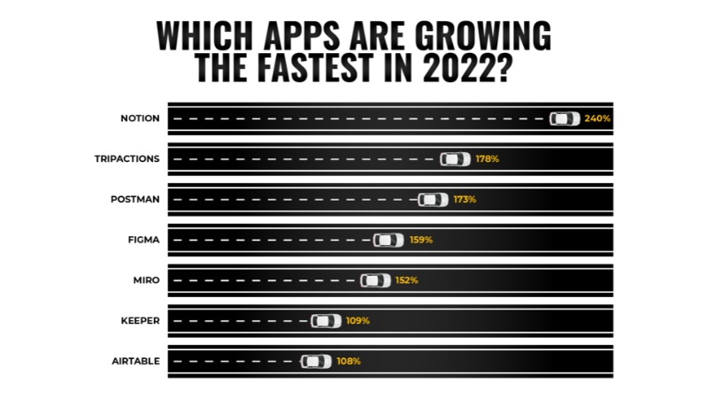 Visualisasi data juga dapat menggunakan metafora visual untuk membantu menyampaikan pesan mereka dalam sekejap. Di sini, kami membumbui grafik batang sederhana dengan mobil di trek balap, menyampaikan momentum maju yang dimiliki aplikasi ini. Pertimbangkan visual apa yang dapat membantu menyampaikan maksud Anda. Misalnya, jam dapat mewakili urgensi, sedangkan luar angkasa dapat mewakili penemuan dan inovasi.