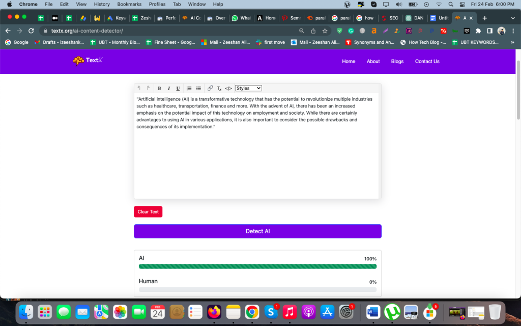 Sekarang kami meletakkan teks ini di detektor AI bernama TextX dan menekan tombol "Deteksi AI":