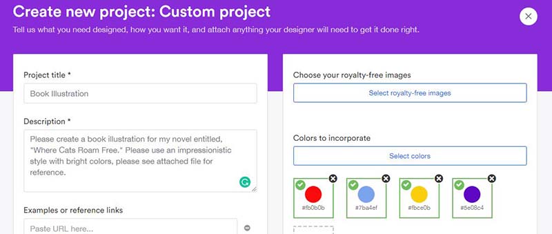 Jika yang Anda inginkan tidak ada dalam daftar, klik tombol "Buat proyek khusus". Anda akan dibawa ke halaman di mana Anda perlu menambahkan rincian proyek. Berikan judul yang sesuai dan tambahkan deskripsi ilustrasi yang Anda inginkan.