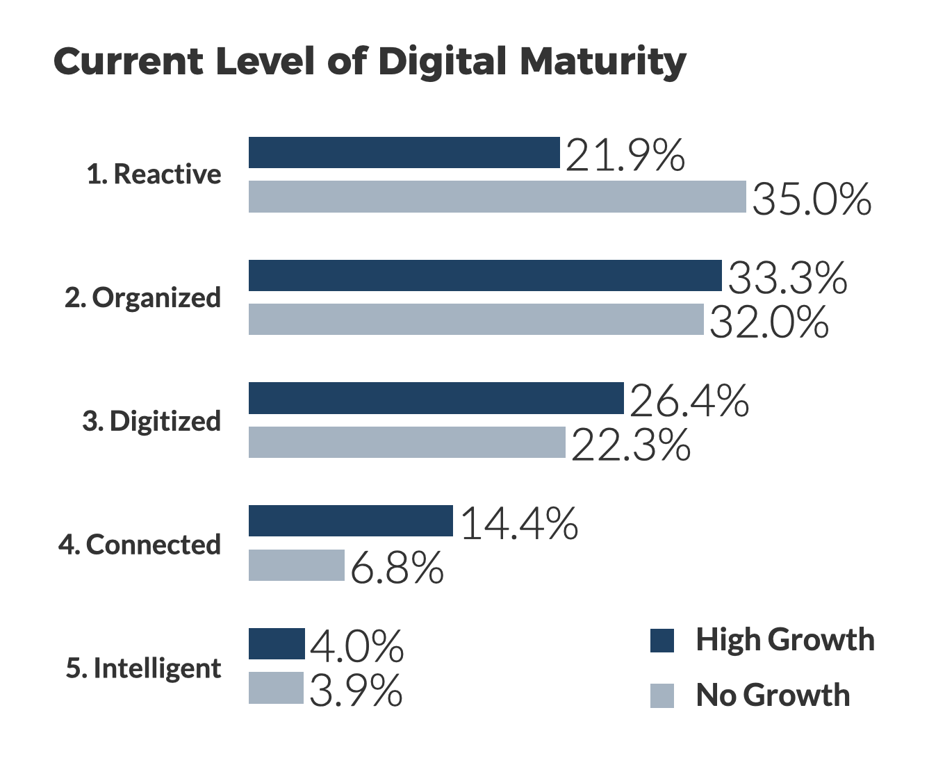 Teknologi digital menawarkan berbagai peluang bagi perusahaan untuk meningkatkan produktivitas dan fleksibilitas mereka. Studi tahun ini dengan jelas mendokumentasikan bagaimana perusahaan dengan Pertumbuhan Tinggi memanfaatkan peluang ini. Bagan berikut menunjukkan bahwa perusahaan dengan Pertumbuhan Tinggi memiliki tingkat kematangan digital yang lebih tinggi daripada rekan-rekan Tanpa Pertumbuhan mereka. Mereka lebih cenderung menggunakan teknologi digital di berbagai proses bisnis (rincian jenis teknologi yang digunakan tersedia dalam laporan lengkap industri).