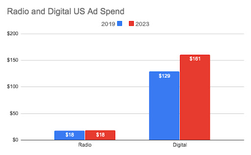 Meskipun radio masih menjadi komponen penting dalam strategi banyak pengiklan lokal, mereka mungkin tidak akan berinvestasi lebih banyak pada saluran tersebut. Berikut perbandingan belanja iklan tahun 2019 dengan proyeksi angka tahun 2023: