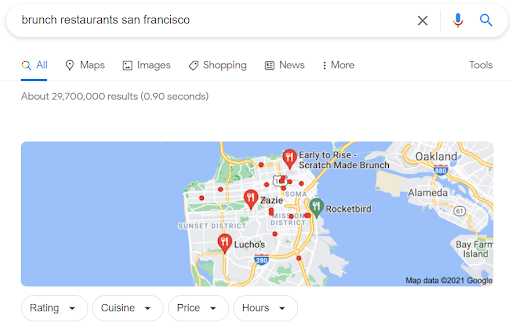Oleh karena itu, agar dapat ditemukan dalam penelusuran lokal umum untuk 'restoran brunch (masukkan nama kota)', atau 'restoran brunch di dekat saya', penting untuk berada di SERP pertama.