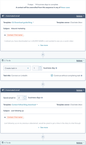 Platform perangkat lunak otomatisasi HubSpot memungkinkan Anda untuk mengatur tindakan yang akan dipicu selama jam kerja hanya jika Anda ingin email muncul seolah-olah dikirim oleh tim. Atau, biarkan alur kerja berjalan 24/7 untuk memberikan kepuasan instan kepada prospek jika mereka sedang melakukan riset pada pukul 3 pagi.