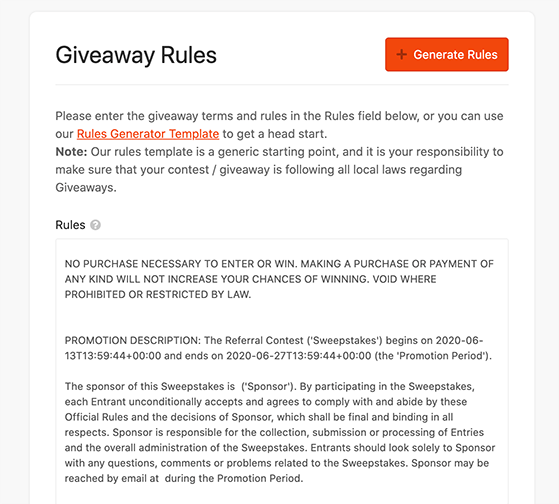 Aturan giveaway Anda menjadi dasar dari apa yang diharapkan peserta saat berpartisipasi. Di sinilah pengguna mempelajari cara ikut serta, siapa yang dapat berpartisipasi, hadiah yang ditawarkan, dan detail relevan lainnya.
