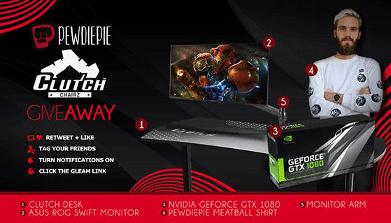 Influencer YouTube terkenal Pewdiepie bekerja sama dengan Clutch Chairs dalam contoh giveaway influencer ini.