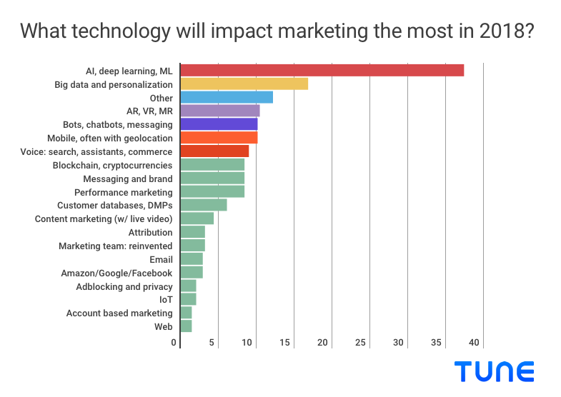 Seperti yang Anda lihat, AI sejauh ini memimpin dengan hampir 40% pemasar mengatakan kecerdasan buatan, pembelajaran mesin, atau pembelajaran mendalam akan menjadi teknologi paling transformatif bagi pemasar di tahun mendatang. Tambahkan ke bot/chatbots dan pencarian suara dan asisten, yang mengandalkan berbagai tingkat AI untuk kecerdasan mereka, dan Anda mencapai hampir tiga perempat pemasar.