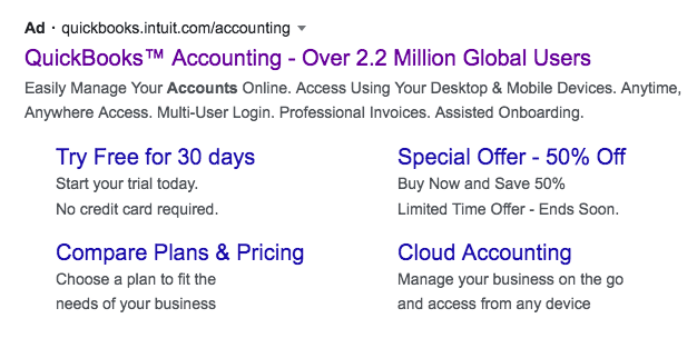Sertakan CTA yang menarik . Anda mendapatkan perhatian pengunjung Anda. Sekarang sertakan salinan yang ditulis dengan baik untuk ajakan bertindak (CTA) Anda agar mereka mengklik. Ini membantu untuk menggunakan kata-kata yang dapat ditindaklanjuti dan memperjelas manfaatnya. Iklan QuickBooks, misalnya, menggunakan “Coba Gratis selama 30 hari” dan “Beli Sekarang dan Hemat 50%”.