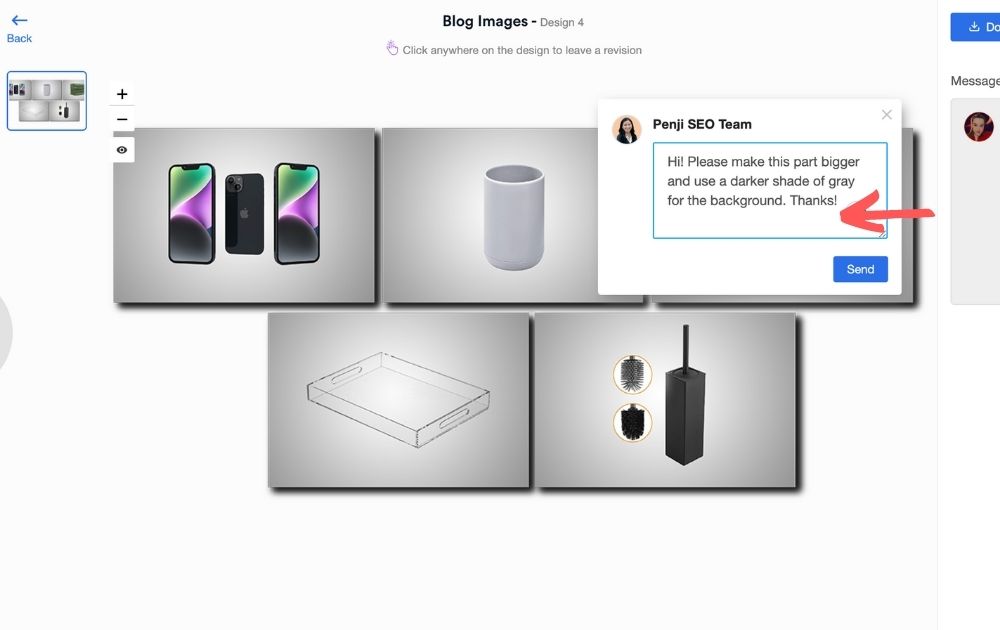 Proyek akan diberikan kepada desainer yang berspesialisasi dalam kategori pilihan Anda. Mereka akan mengirimi Anda pesan untuk mengonfirmasi bahwa mereka telah menerima permintaan Anda. Mereka juga akan memberi tahu Anda jika mereka memiliki pertanyaan tentang pengarahan tersebut. Setelah draf selesai, Anda akan menerima file melalui aplikasi. Jika Anda menginginkan sesuatu direvisi, Anda dapat mengklik bagian itu dan mengetik komentar atau instruksi Anda.
