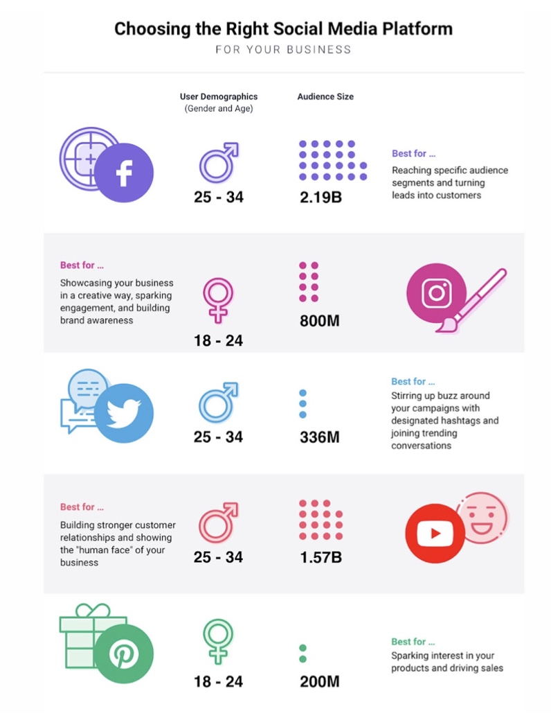 Sebaliknya, temukan platform terbaik yang sesuai dengan target pasar Anda. Misalnya, jika Anda adalah merek B2B, LinkedIn adalah platform media sosial yang hebat di mana Anda dapat menemukan pemilik bisnis dan eksekutif. Sebaliknya, jika merek Anda hanya menjual kopi, maka jaringan visual seperti Instagram atau Pinterest akan menjadi cara yang tepat.