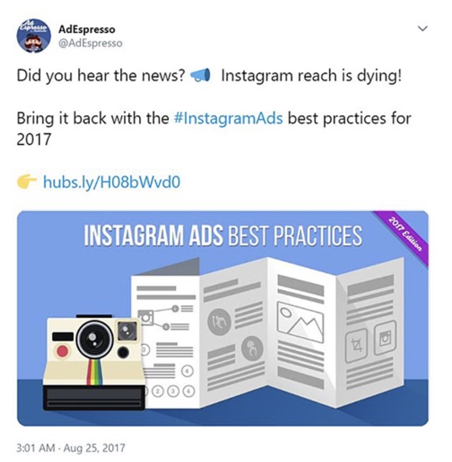 Dengan melakukan ini, Anda akan dapat menarik perhatian pemirsa dengan lebih baik. Audiens Anda bisa saja menggulir melewati postingan Anda saat pertama kali melihatnya. Tetapi kait menarik yang Anda tambahkan untuk kedua kalinya dapat membuat mereka memperhatikan dan berinteraksi dengannya. Ini berarti Anda dapat memperoleh lebih banyak komitmen dengan membagikan ulang materi yang sama. AdEspresso telah mendapatkan banyak keuntungan dari strategi branding media sosial ini. Mereka berbagi artikel yang sama dengan audiens mereka, tetapi dengan judul yang berbeda. Inilah yang pertama.