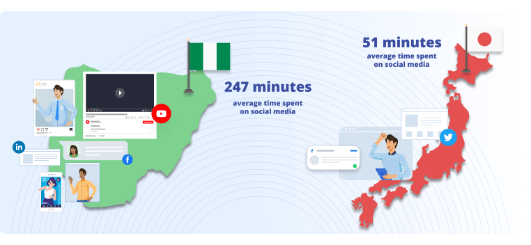 Pada tahun 2022, rata-rata waktu yang dihabiskan setiap hari di media sosial di seluruh dunia adalah 147 menit. Jumlah ini berbeda dari satu negara ke negara lain, misalnya:
