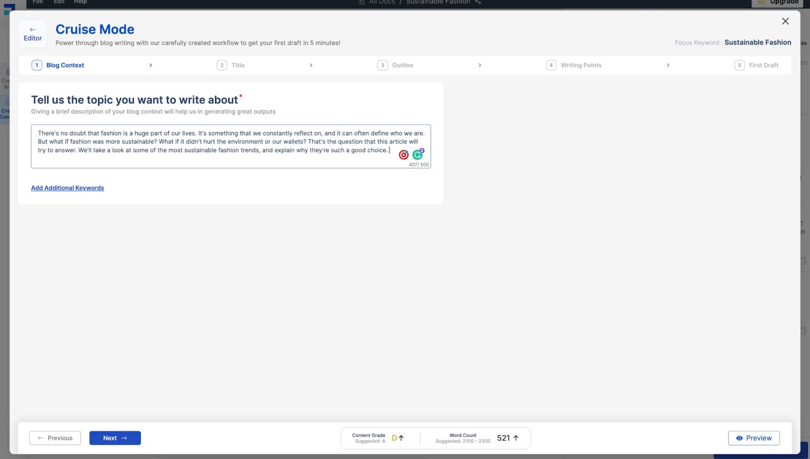 - Cruise Mode: Ini adalah solusi sempurna jika Anda kehabisan ide atau bekerja melawan waktu. Beri masukan minimal ke Mode Pesiar - alat penulis AI dan dapatkan postingan blog lengkap yang ditulis untuk Anda dalam beberapa menit.