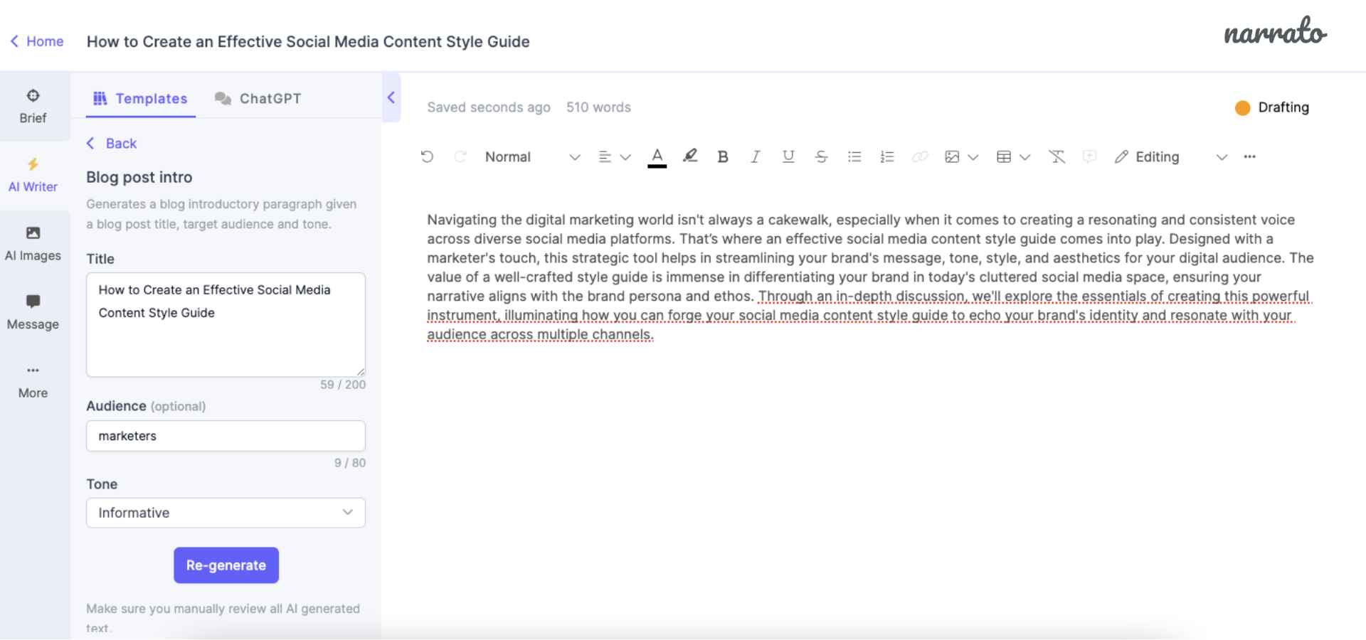 Penulis AI Narrato memiliki template khusus untuk membuat intro artikel – Blog Post Intro . Masukkan judul artikel, dan tentukan audiens dan nada Anda. Dan voila! Intro artikel akan dibuat hampir secara instan.