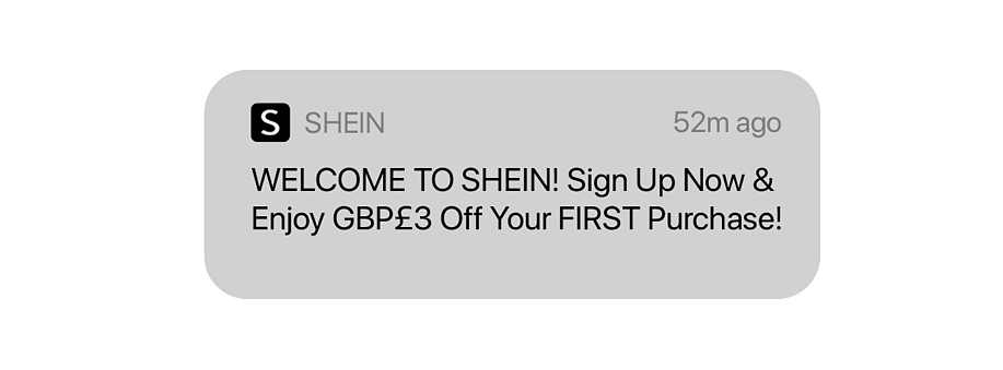 Secara teori, aplikasi memerlukan pendaftaran akun hanya ketika pengguna memutuskan untuk melakukan pembelian. Tetapi pemasar aplikasi, seperti Shein, mendorong pengguna untuk mendaftar lebih cepat melalui pemberitahuan push selamat datang yang tepat waktu.