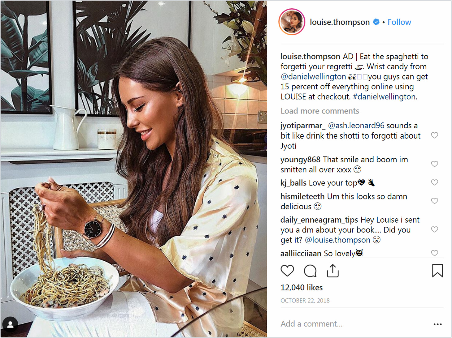 Le persone si fidano e ascoltano i consigli degli influencer. Nella maggior parte dei casi, forniscono prodotti che consentono alle persone di risparmiare denaro e ottenere articoli di qualità. È probabile che gli utenti controlleranno il tuo sito web dopo averlo visto pubblicizzato su Instagram di un influencer. Per capire quali influencer generano più vendite, è importante creare un codice promozionale o un URL univoco per ogni opinion leader. Quando promuovi il contenuto, chiedi loro di taggare il tuo account per incoraggiare il pubblico a effettuare un acquisto. Questo tipo di link e codici promozionali ti aiuterà a valutare le tue prestazioni e incoraggerà le persone ad agire. Louise Thompson, una fashion blogger, lavora con le aziende per promuovere i loro prodotti. Dai un'occhiata a come ha pubblicato una foto con indosso l'orologio Daniel Wellington:
