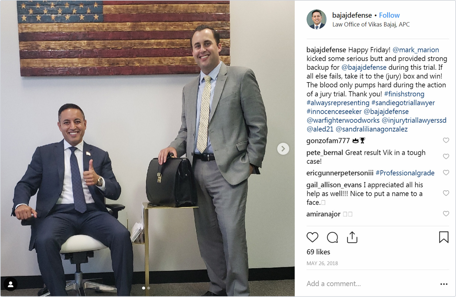 Questo tipo di sensibilizzazione dell'influencer di solito include foto o video dell'account che gli influencer stanno gridando. È uno dei modi migliori e più veloci per creare follower e ottenere la migliore consapevolezza possibile sul feed di Instagram. Dare shoutout a un altro utente o marchio per seguire qualcun altro aiuta a costruire relazioni sui social media e ottenere una risposta. Inoltre, otterrai un contenuto gratuito e nuovi follower: tutto ciò che serve sono poche parole e una foto. Ad esempio, il famoso avvocato difensore criminale Vikas Bajaj ha fatto un appello naturale all'altro famoso avvocato Mark Marion per aver fatto un ottimo lavoro durante il processo.