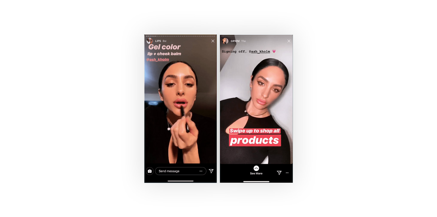 Per semplificare lo shopping, gli influencer possono aggiungere adesivi acquistabili all'interno delle storie per taggare i prodotti all'interno dei loro post con link e prezzi. È un buon modo per i marchi di aumentare le vendite e il traffico da Instagram. Ad esempio, NUDESTIX utilizza blogger di bellezza e influencer per Instagram Stories per mostrare la loro routine di trucco mattutina dove forniscono un link per acquistare i loro prodotti.