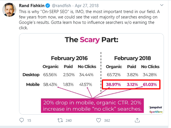 La maggior parte delle tecniche SEO sono implementate per garantire il proprio posizionamento su SERP. Tuttavia, la SEO on-SERP include anche le azioni che non comportano un clic e l'ottimizzazione per la pagina 1 del risultato della ricerca. Rand parla da tempo di SEO on-SERP. Dai un'occhiata al suo tweet in cui sottolinea perché avere un'efficace strategia SEO sulla SERP è fondamentale.