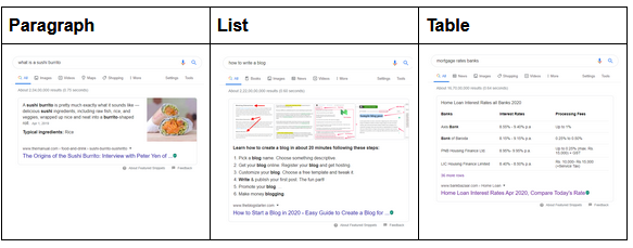 Il formato dei tuoi contenuti dovrebbe essere in base al tipo di FS a cui ti rivolgi. Ad esempio, se stai mirando all'elenco FS, assicurati che il tuo contenuto sia ben strutturato in un formato elenco con intestazioni descrittive e tag di intestazione H1, H2 e così via. Usa frasi brevi ed efficaci che offrono risposte dirette. Aggiungi l'immagine pertinente per la risposta.